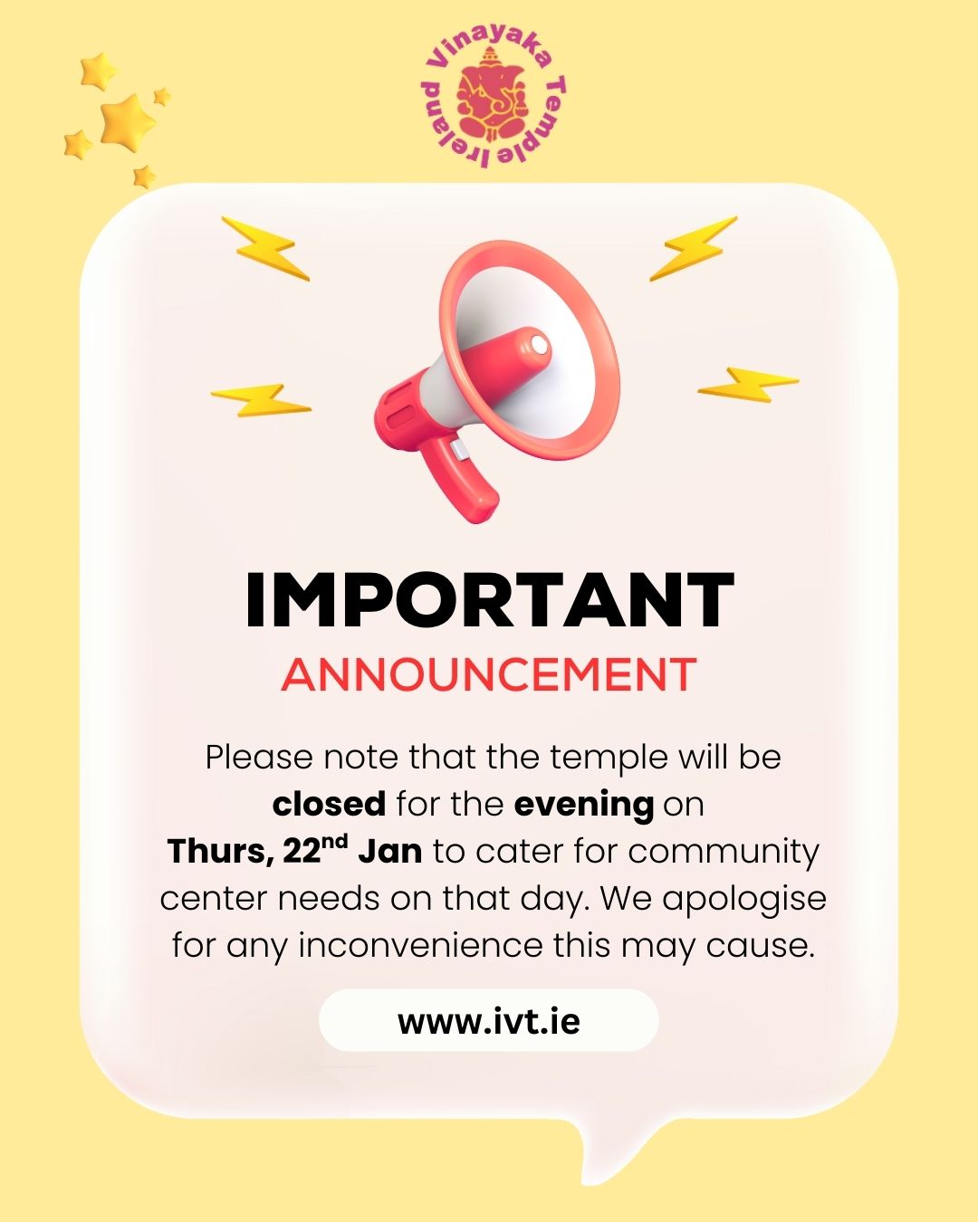 If you are willing to volunteer to service Lord Vinayaka, kindly email your interest to feedback@ivt.ie.